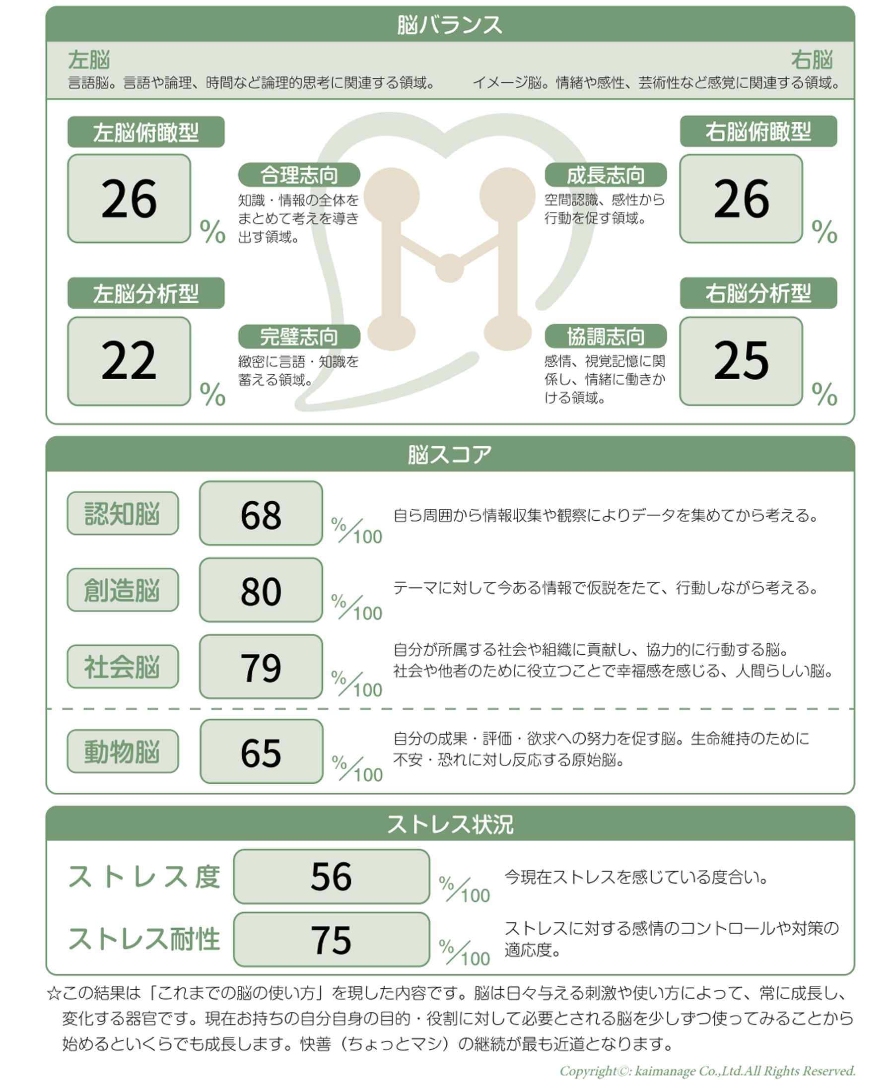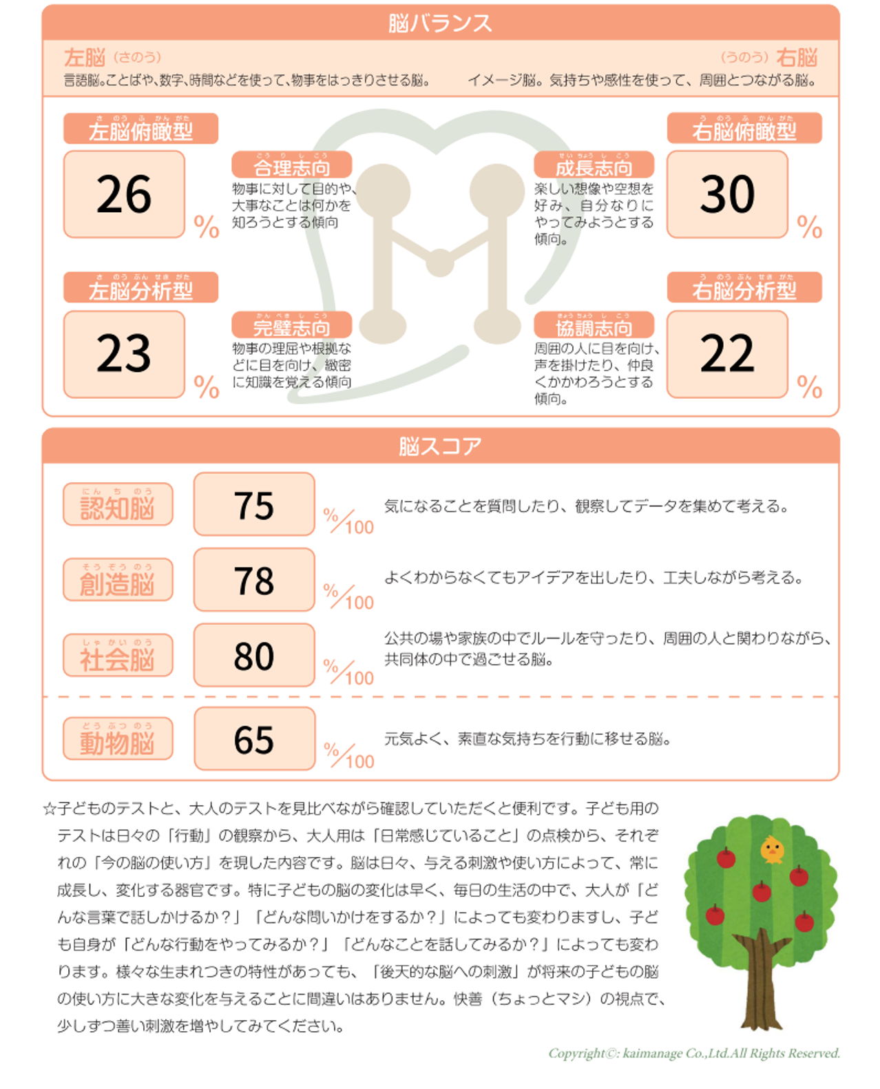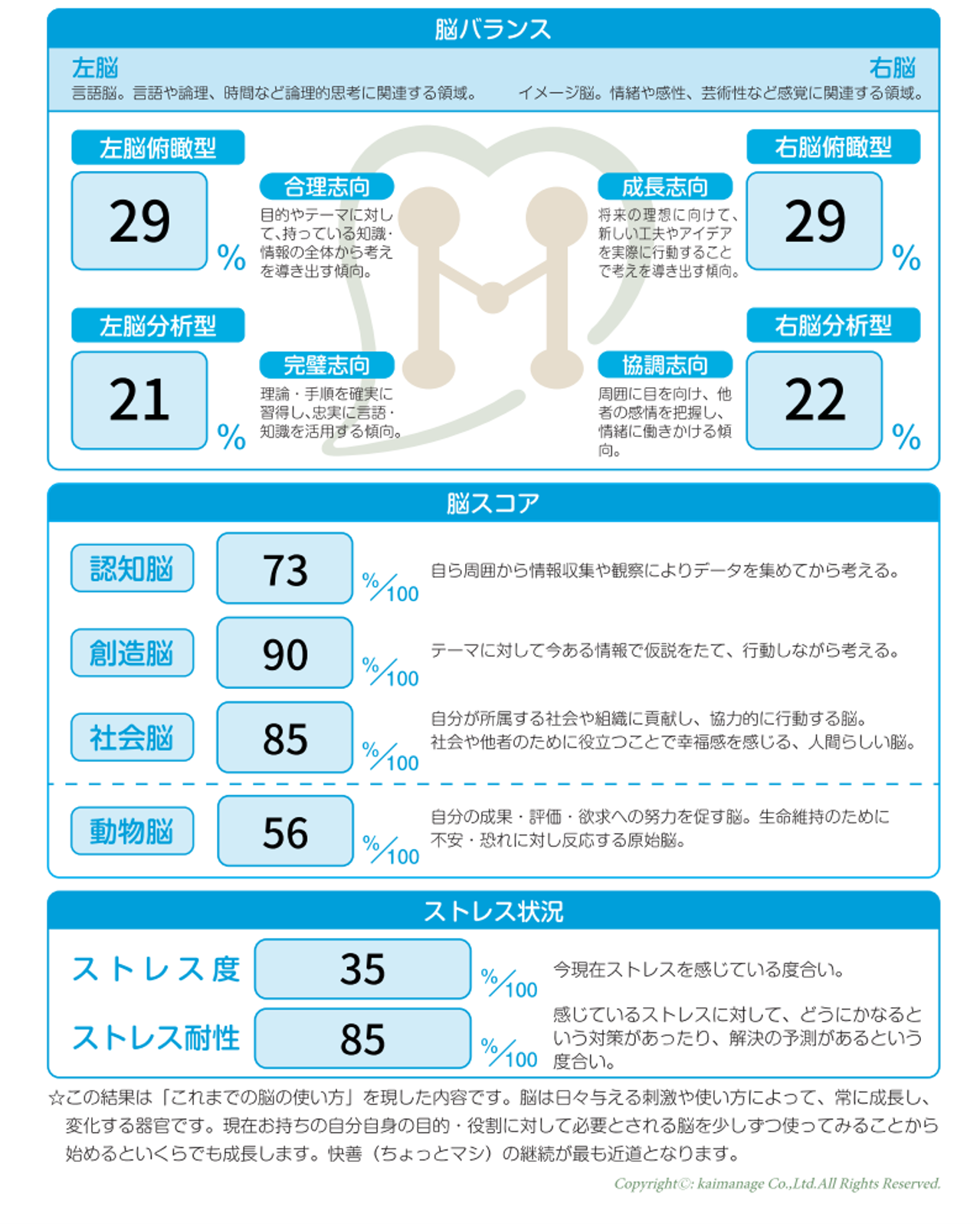 結果表と合わせてご覧いただくことで、自分の脳の使い方を知って、偏りにより浮かびやすい発想を理解して、脳を鍛えるヒント、負荷を掛けない能力開発の道しるべとしていただきます。